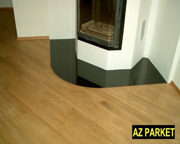 Luxusní byt v Pardubicích - nástavba. Na základě požadavku investora a architekta byl vyřešen kruhový přechod mezi masivní dubovou palubkovou podlahou a mramorem u krbových kamen. Použita speciální technologie frézování otvoru. Dilatace palubek zajištěna vloženou korkovou lištou.
